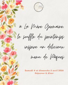 Les équipes de La Mère Germaine vous reçoivent au déjeuner de 12h à 13h15 et pour le dîner de 19h00 à 20h30, du mercredi midi au dimanche soir.