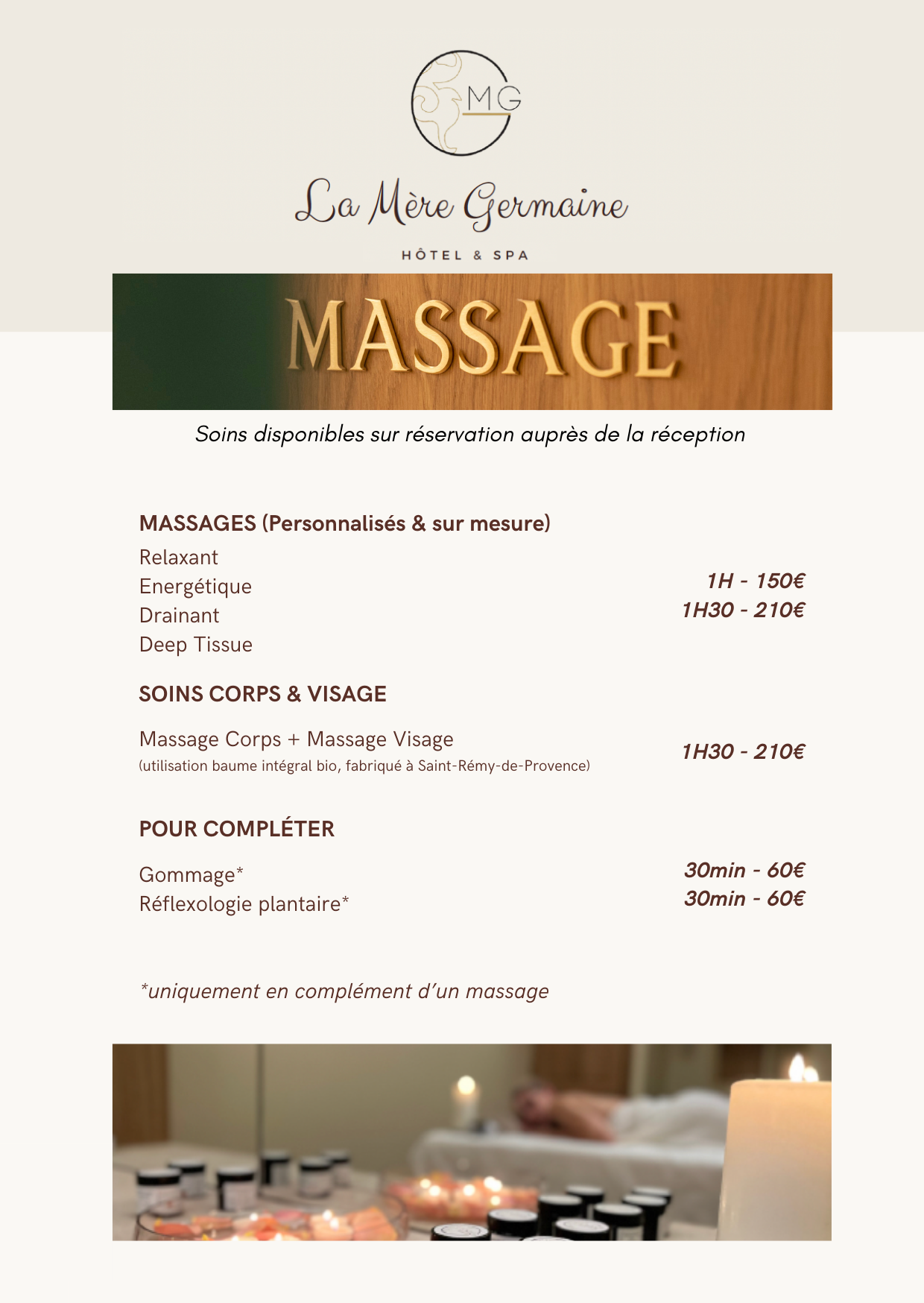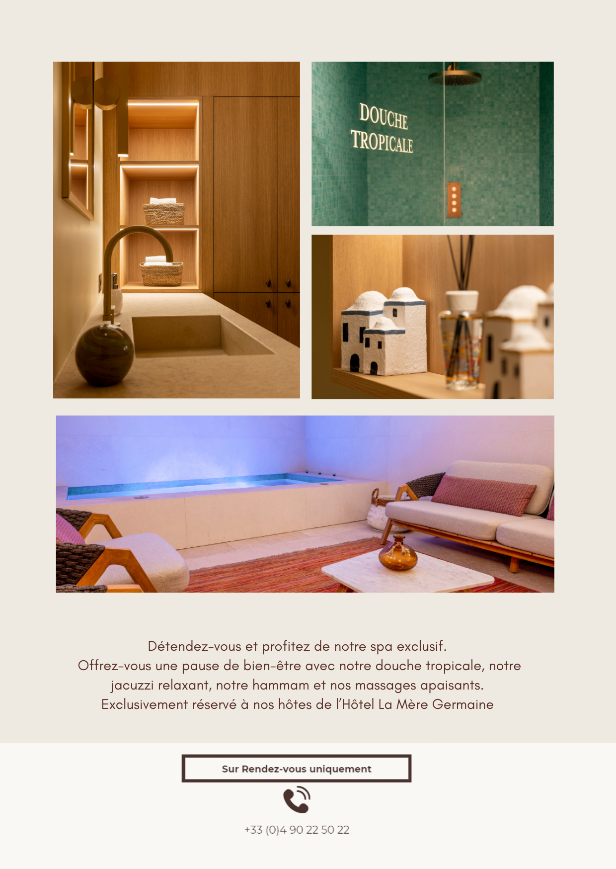 Pour toute réservation de soins, nous vous invitons à vous rapprocher de notre équipe réception.