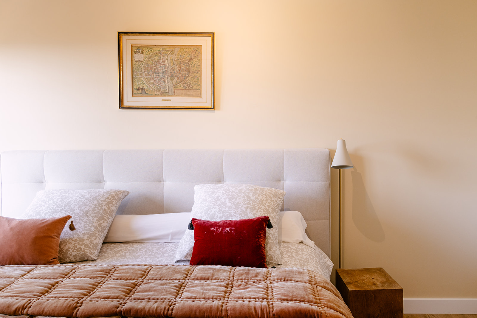 L’étage, avec ses 4 chambres et 3 salles de bains, est décoré dans un style plus épuré et contemporain. La chambre Master bénéficie d’un espace séparé avec canapé-lit pour des enfants. Chaque chambre est équipée de lits haut de gamme. Deux chambres disposent d’un lit de 2 mètres, la troisième chambre d’un lit de 160 cm et la dernière un lit de 140 cm.